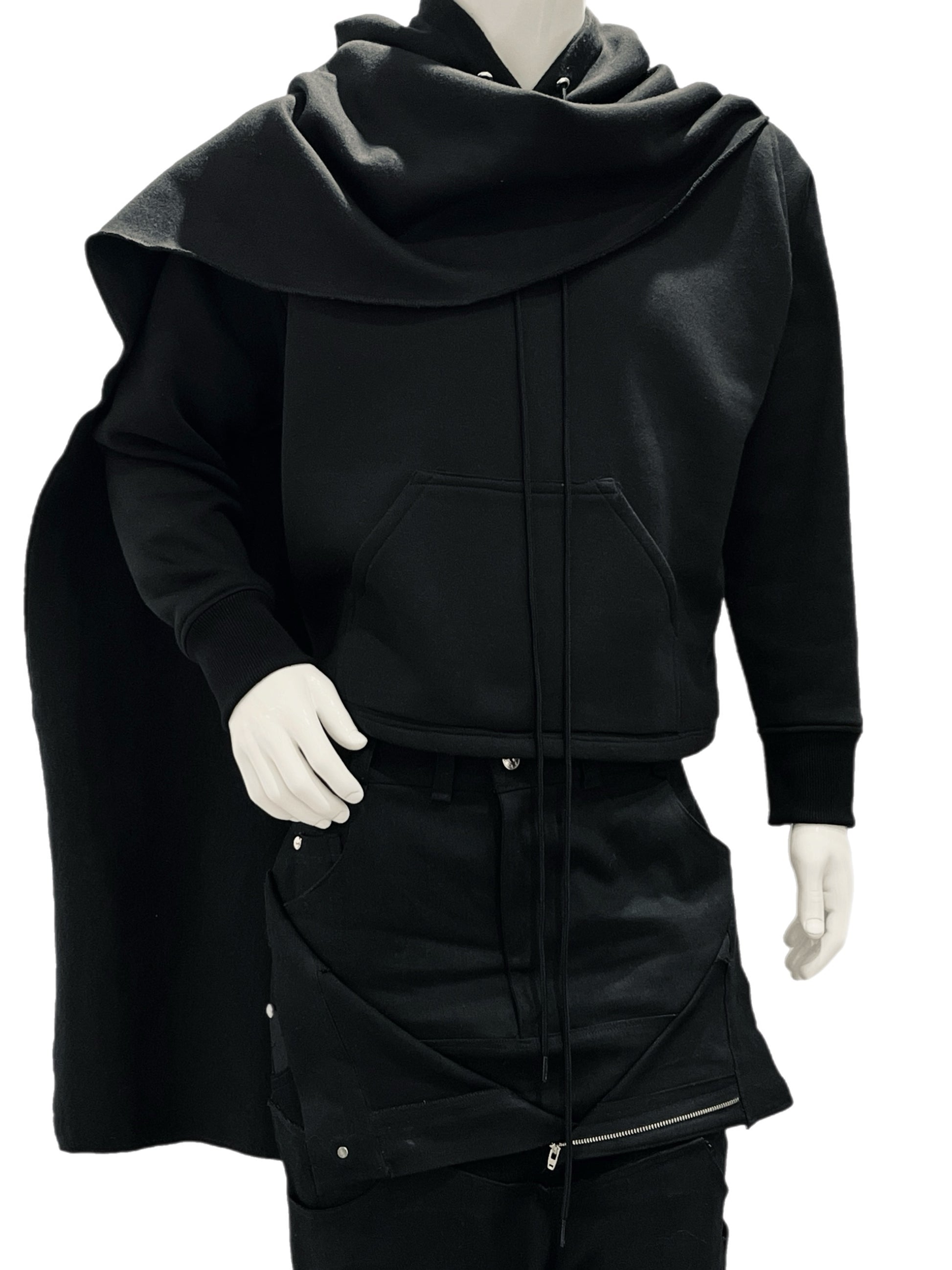 The Bč Crow unisex Hoodie is a cropped new take on a traditional garment. Mixing the idea of a scarf and a hoodie, the coziness and stylish vibes you’ll receive from wearing this garment is limitless. There are a couple of ways to wear your hoodie. The attached scarf gives extra drama as well as warmth.