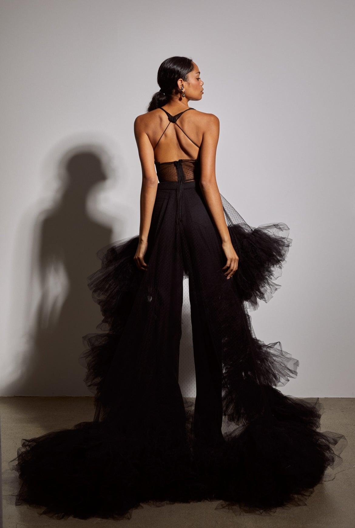 The Bč “Josephine” lace blouse is an extravagantly bold garment. This play on a gown and blouse is backless and fits to perfection. The hi-low detail showcases just enough ruffle drama for for any Queen.